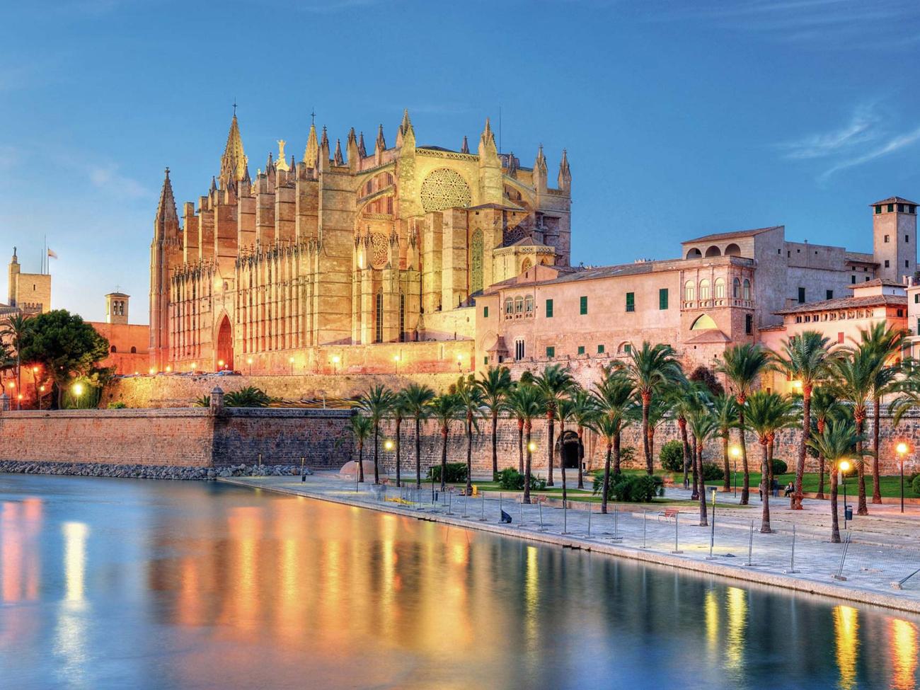 La inmensa catedral de Santa María, también conocido como la «Catedral de la Luz», es un monumento gótico que se empezó a construir en el siglo XIII, domina el horizonte de la bahía de Palma. Junto a esta se halla la Almudaina, una fortaleza de estilo árabe convertida en residencia real.