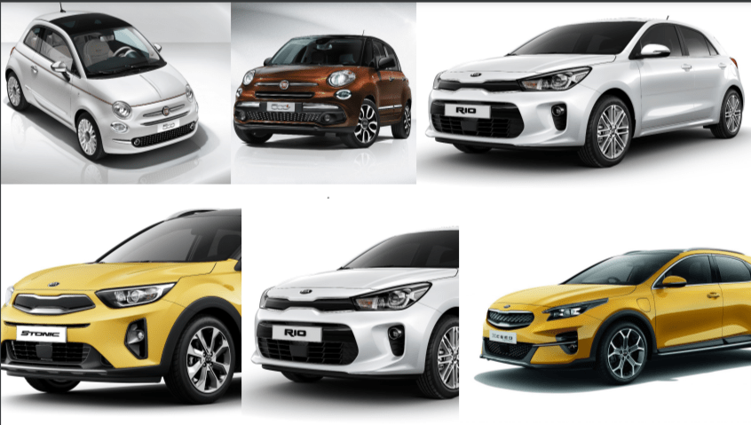 Fiat 500, Fiat Tipo SW, Fiat 500 L, Kia Rio, Kia Stonic y Kia XCeed.